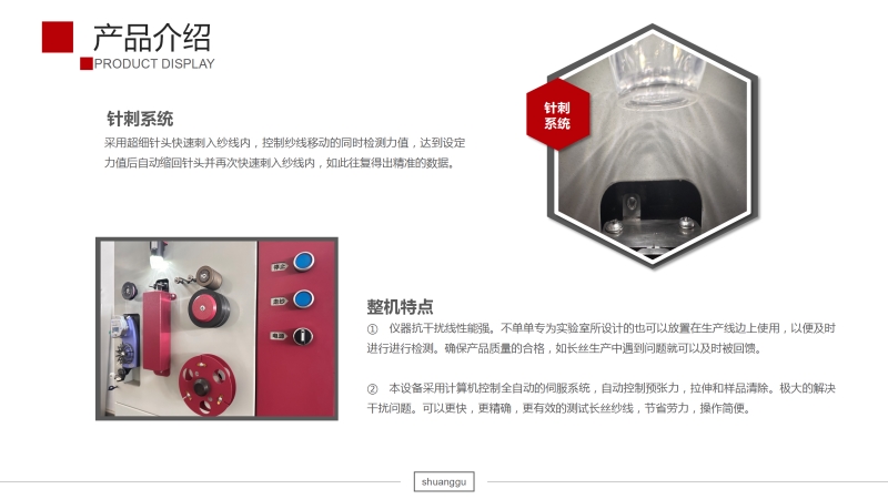 ⑤.本設(shè)備采用計(jì)算機(jī)控制全自動(dòng)的伺服系統(tǒng),自動(dòng)控制預(yù)張力、拉伸和樣品清除,極大地解決了干擾問(wèn)題,可以更快、更精確、更有效的測(cè)試長(zhǎng)絲紗線,節(jié)省勞力,操作簡(jiǎn)便。