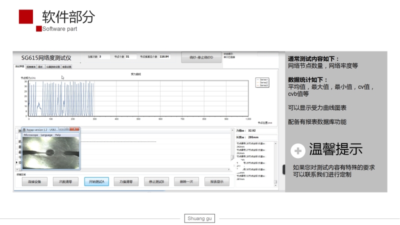 SG615型全自動(dòng)長(zhǎng)絲網(wǎng)絡(luò)度測(cè)試儀用于測(cè)試合成纖維長(zhǎng)絲網(wǎng)絡(luò)度,采用儀器移針?lè)?,可以測(cè)試FDY、DTY的網(wǎng)絡(luò)結(jié)點(diǎn)數(shù)和網(wǎng)絡(luò)牢度,產(chǎn)品符合: FZ/T 50001《合成纖維長(zhǎng)絲網(wǎng)絡(luò)度試驗(yàn)方法》。